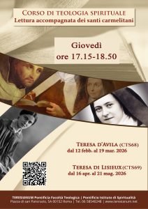 Sono questi solo alcuni degli spunti di una “spiritualità dell’immagine” che rimane un orizzonte immenso di esplorazione per la nostra riflessione teologica e per la nostra chiamata alla santità, orizzonte da contemplare – come tenteremo di fare nel susseguirsi delle giornate e dei relatori – secondo variegate angolature: quella dell’integrazione dell’immaginazione in una teologia sapienziale; quella della pastorale della carità e dell’evangelizzazione; quella della storia dell’arte (è incluso nel programma anche un godibilissimo spettacolo teatrale sull’estasi di Teresa del Bernini) e della filosofia; nonché infine quella carmelitana: «La memoria delle immagini non potrà non far progredire l’anima, perché è associata all’amore di chi è raffigurato», afferma il santo poeta Giovanni della Croce (3Subída 15,2), riecheggiando le parole dello stesso Gesù a Teresa d’Avila, in riferimento a certe belle immagini da custodire: «non lasciare nulla di ciò che può svegliarti all’amore!» (Relación 30). Ci permettiamo di ripetere questo stesso invito a tutti coloro che vorranno partecipare alla nostra 67° Settimana di Spiritualità!